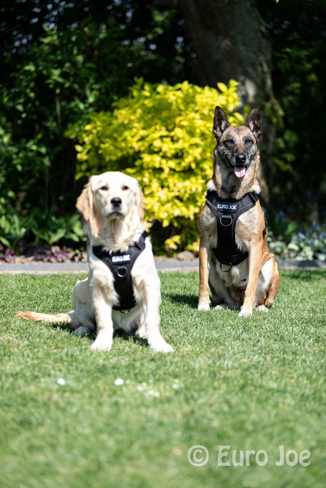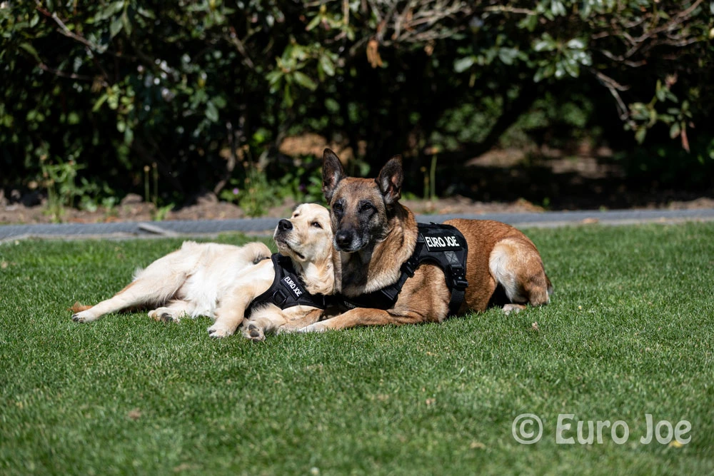 The Malinois “Keppe” wears a Large, the Golden Retriever puppy “Bee” (6 months), wears a Medium.