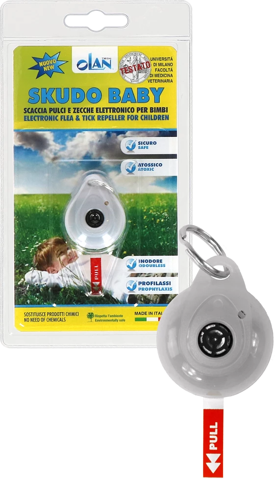 Aangezien kinderen gevoelig en kwetsbaar zijn, hebben ze soms extra bescherming nodig. Skudo Baby is de natuurlijke en veilige oplossing welke geen risico’s met zich meebrengt. Vlo-beten zijn vaak de oorzaak van allergische dermatitis,vanwege hun allergeenrijke speeksel. Het apparaat geeft een reeks ultrasone impulsen die de parasieten storen. Stoort mensen en huisdieren niet, waardoor kinderen die in parken, tuinen of met hun hond / kat spelen, beschermd blijven. De Skudo kan worden bevestigd aan de kinderwagen, de pols, de nek, (met het geperforeerde deel richting de huid). Zodra het rode lipje is verwijderd, werkt het apparaat continu voor 10/12 maanden dankzij een niet-oplaadbare batterij. Het is vocht-en waterbestendig en gebruikt geen vervuilende chemicaliën. Formaat3,5 x 2,9 x 1,9 cm